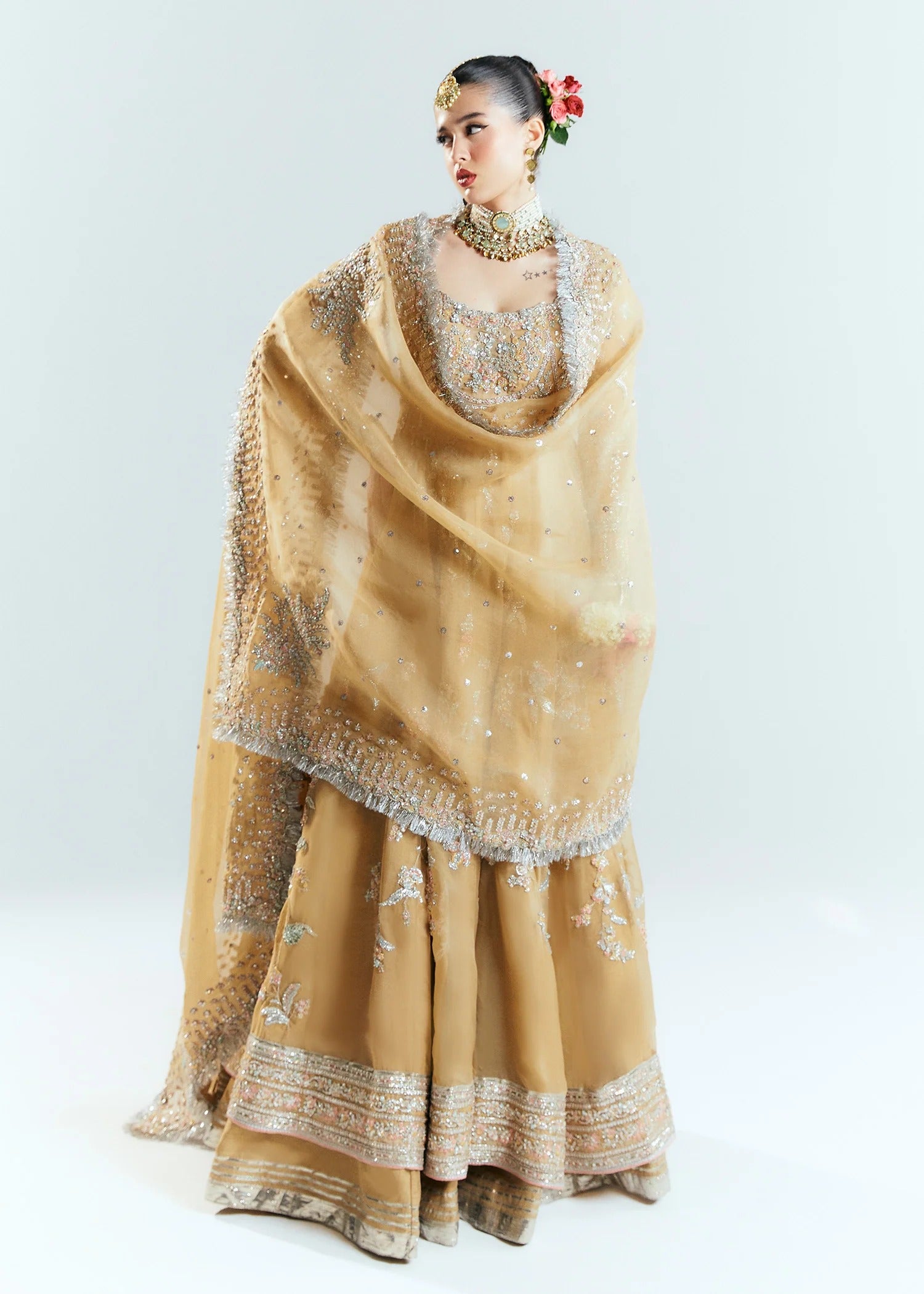 A symphony of artistry and opulence woven into every thread. Hand embellished bodice meets shimmering floral flare delicately embellished. The simple korean raw-silk lehnga sways with grace and adds the volume to the attire, while the exquisite dupatta, trimmed with kiran on four sides completes this masterpiece of regal splendour.