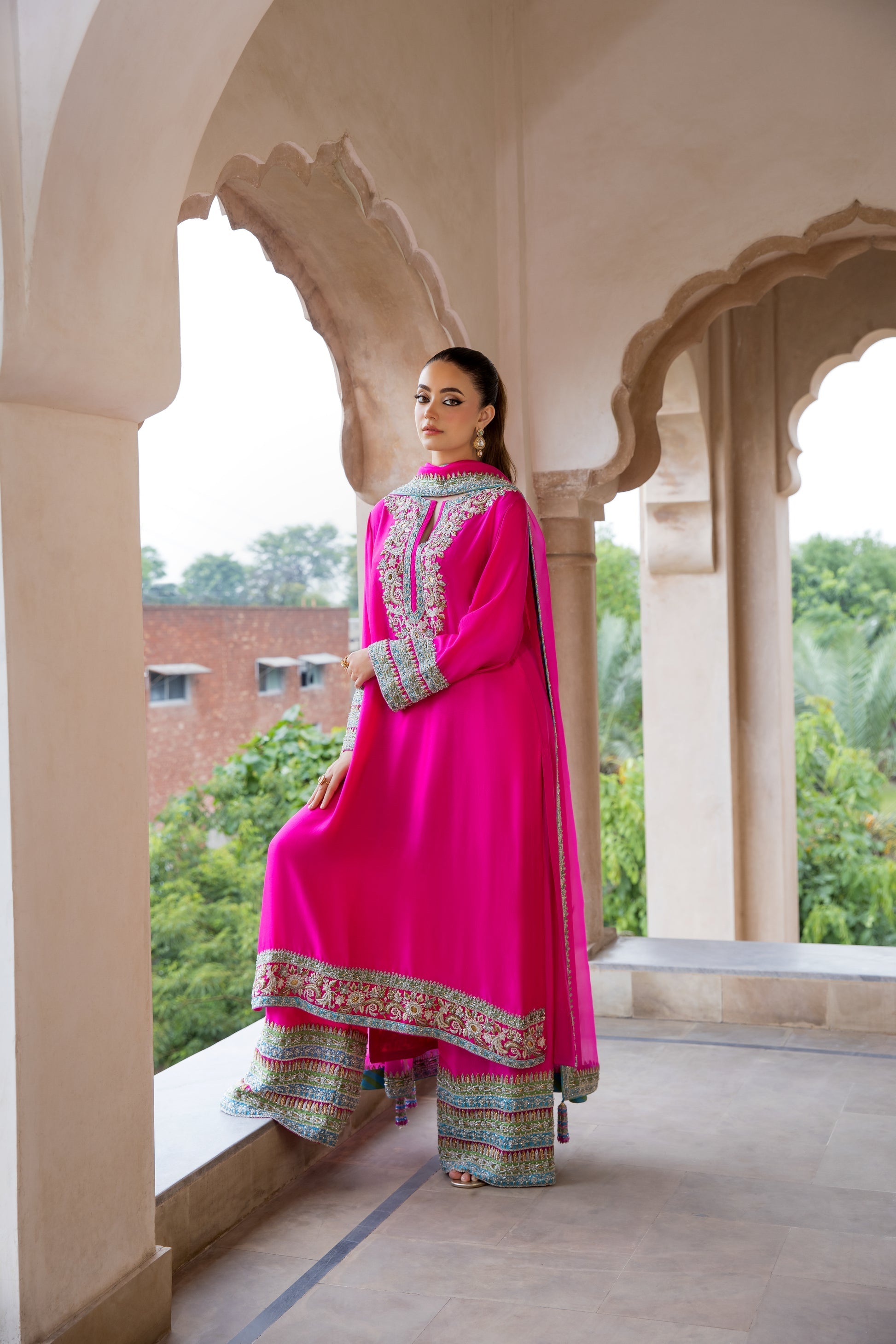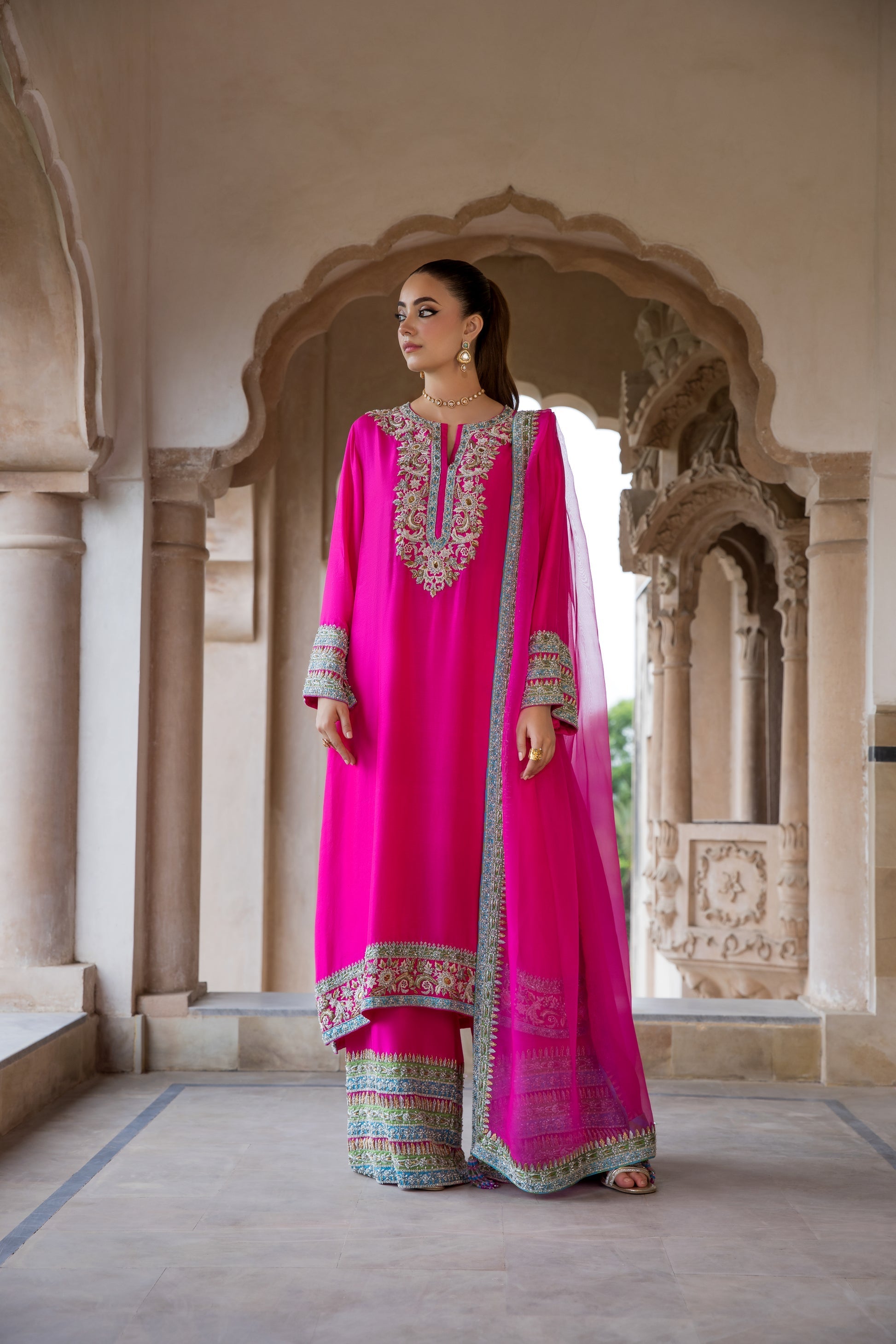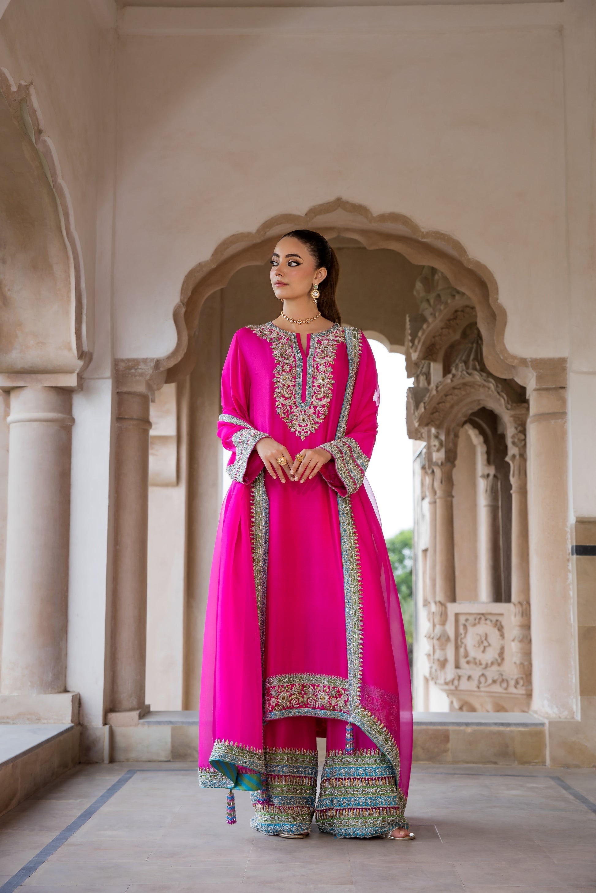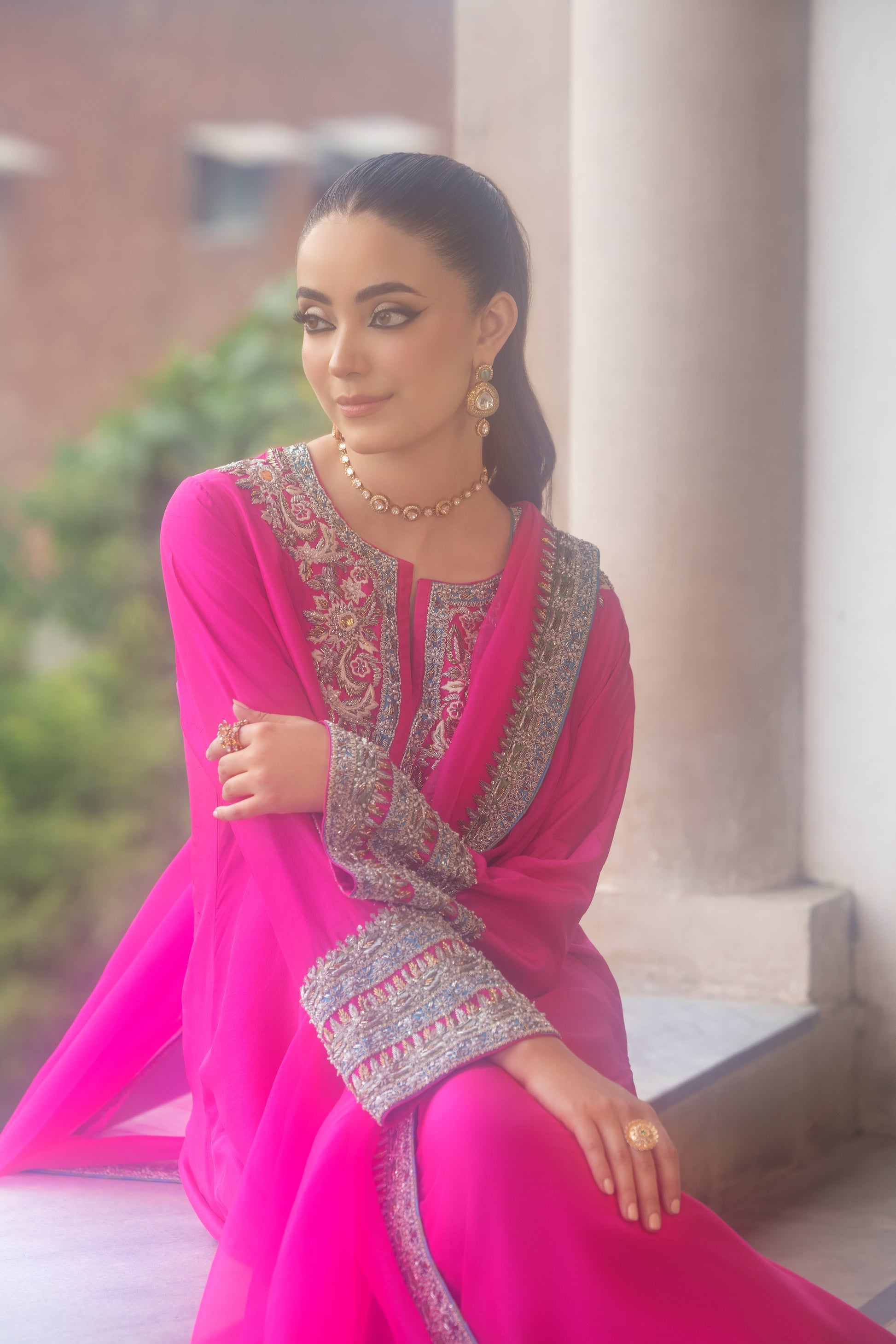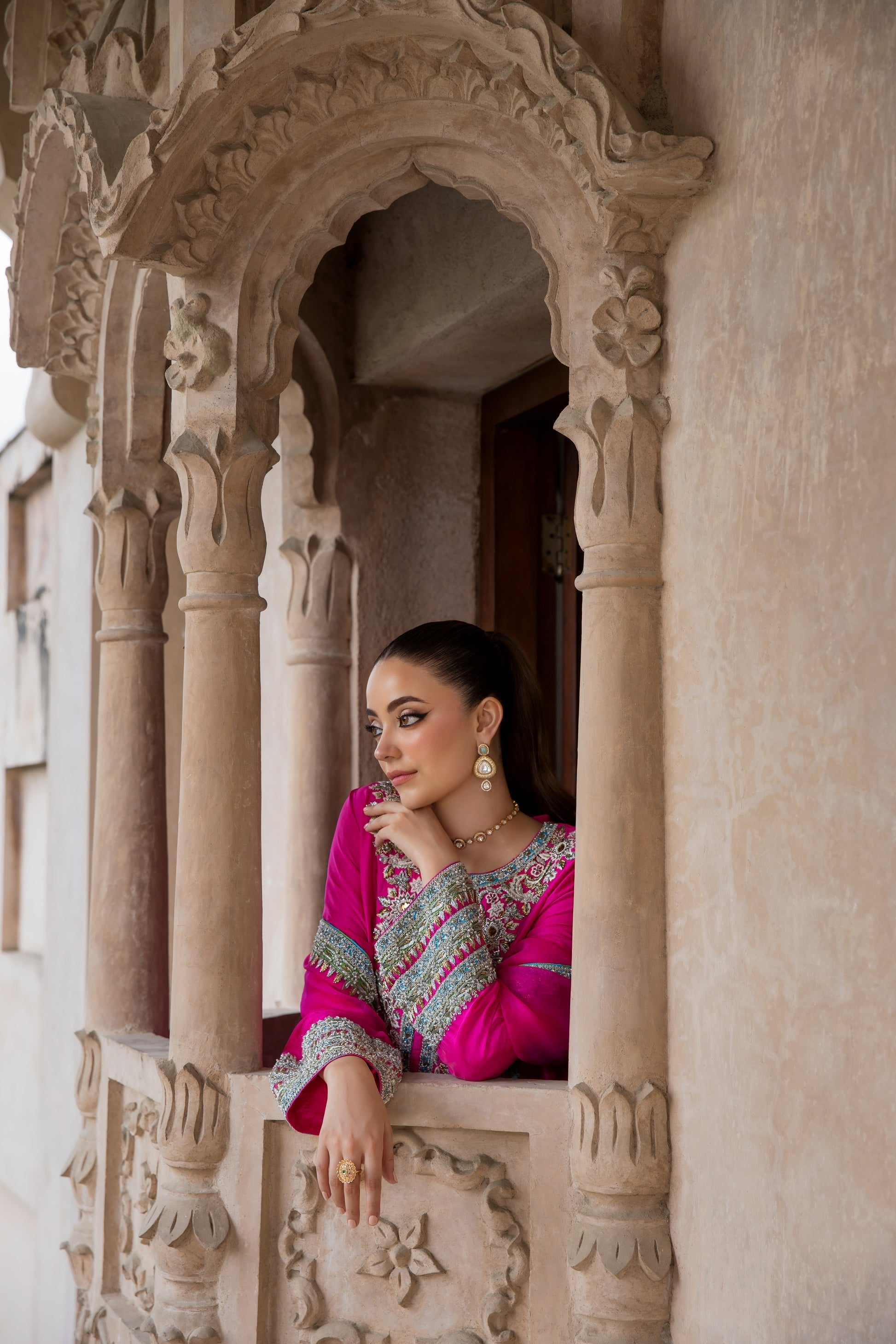 An ode to new beginnings, Anisha blooms in pure raw silk, paired with a sheer organza dupatta. The ensemble is elevated with exquisite hand-made embellishments on the neckline, sleeves, and borders, shimmering with artisanal finesse. Drenched in a vibrant fuchsia hue, it captures the spirit of spring and wedding festivities making it the perfect choice for celebratory soirées and formal gatherings.