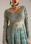 A dainty Ice-Blue silhouette, lavishly adorned with intricate embellishments on the front and back bodice, creates an alluring look. The opulent peshwas showcase heavy embellished borders, evoking a regal charm fit for royalty. Accompanying this divine piece is the resplendent silk crushed sharara, draping gracefully and exuding a fairy-tale like aura. Completing this enchanting ensemble is the digital printed dupatta, featuring celestial motifs in mesmerizing hues. Its four sided embellished border exudes an aura of ethereal elegance.