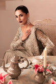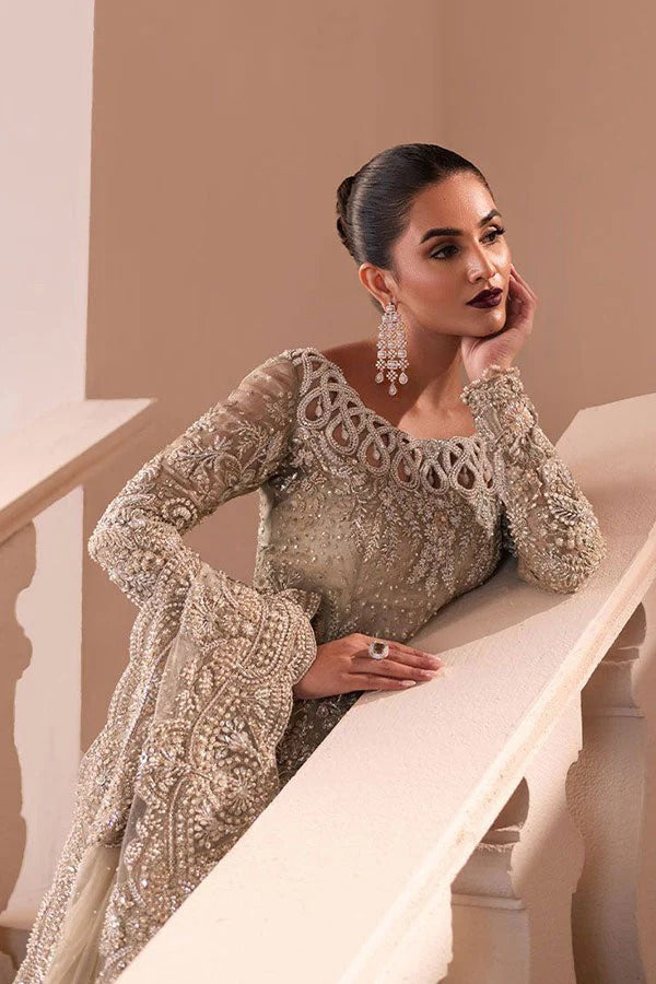 The "Aurora" dress exudes elegance with its intricate embroidery and delicate detailing. The long, flowing silhouette is adorned with sparkling beadwork, creating a luxurious look perfect for special occasions. The neckline features a unique cut-out design, adding a modern twist to the traditional ensemble. Paired with a sheer dupatta that complements the dress's ornate embroidery, the overall look is timeless and sophisticated, ideal for weddings or formal events.