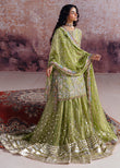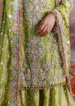Reha evokes the grandeur of a bygone era, where every detail was a testament to festivity. The shirt glistens with intricate zardozi work, its surfaces enlivened with delicate accents of colored thread. Playful handmade tassels dangle in gentle motion, like jeweled whispers echoing the liveliness of mehfils past. The dupatta unfurls as a tapestry of nostalgia, bordered richly on all four sides, its expanse scattered with a dense spray of sequins and mukaish. The edges, kissed with delicate kiren, recall the heirloom finishes of treasured trousseaux, carrying with them the romance of old-school charm. Anchoring the ensemble is a farshi gharara, opulent in sweep and grandeur. Its voluminous flare is scattered with embellishment, culminating in a hem weighted with resplendent gota, each stripe gleaming with the brilliance of molten gold. A matching pouch is a final accent that echoes its vintage soul, proving no detail is left untouched.