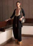 An absolute elegant black raw silk shirt with a heavily embellished neckline with tassels adding to the detail and beauty to this fit. Its paired with shalwar with colorful gota border and a beautiful printed organza dupatta filled with sequin spray. Pair our signature Hussain Rehar bag with it to complete this gracious outfit.