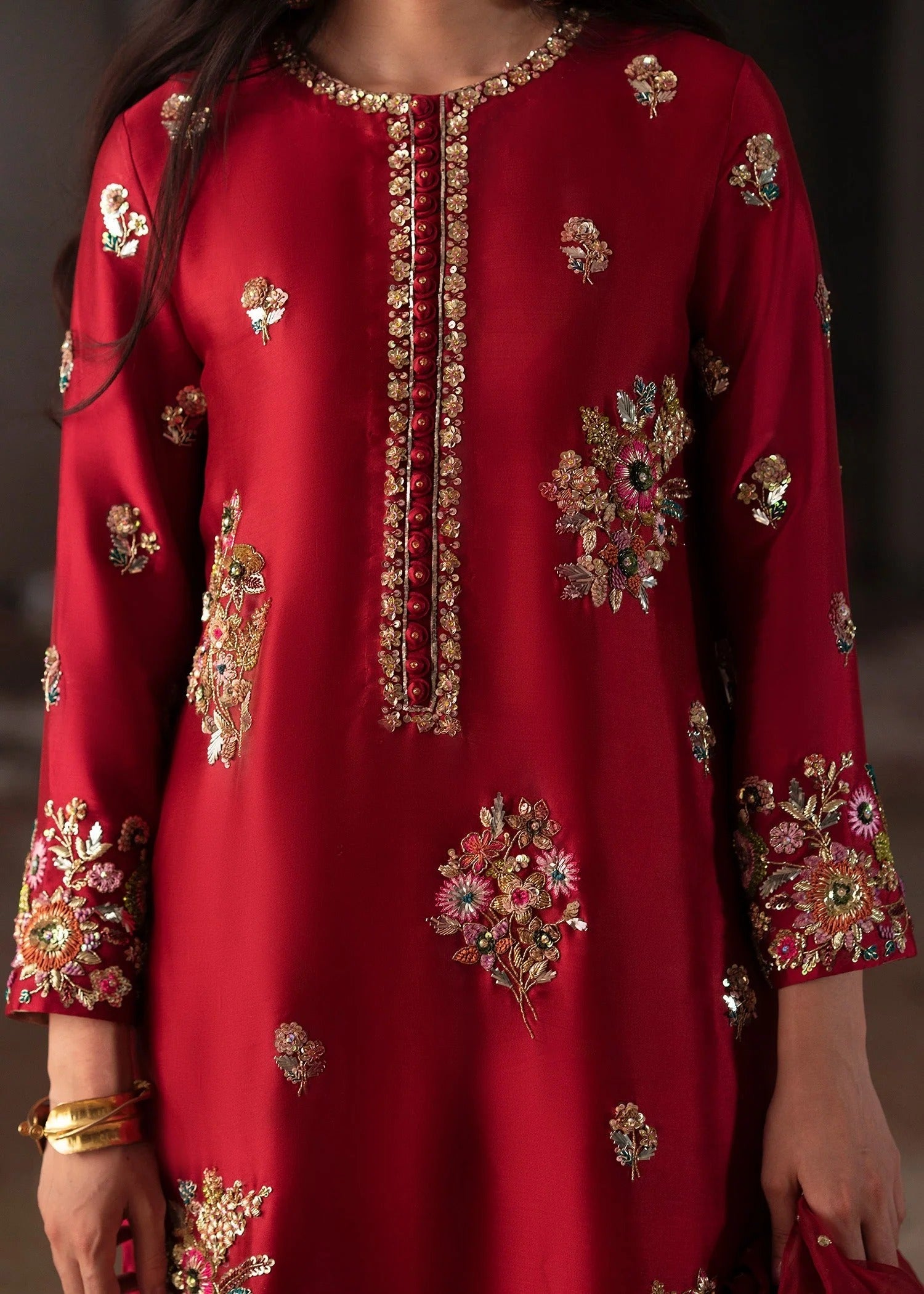 Hand-embroidered detailing with resham and tilla work