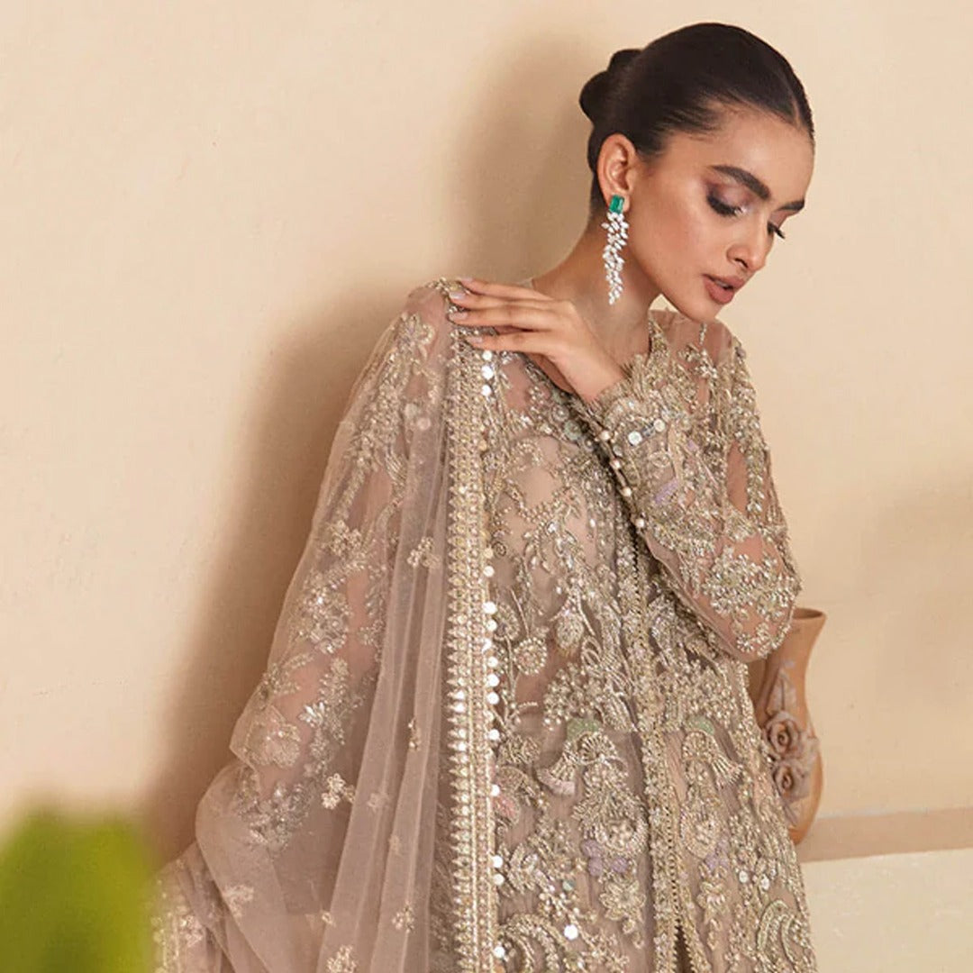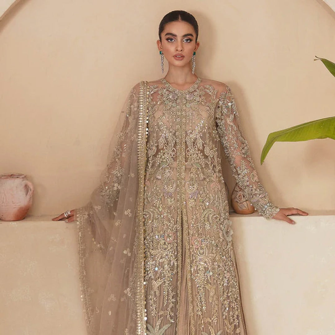 - Dahlia is a modern technique masterpiece essayed in dull gold & skin shades curating an enchanted bridal piece. A mesmerizing net gown beautified with multi-hued pastel shaded work ornamented with gangajamni with sheesha details further fused with dabka and katdana work. A ravishing net dupatta modified with sequins laces and striking raw silk crushed pants adorned with organza borders makes it a statement attire for a perfect wedding day.