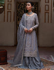 The embellished raw silk kameez is paired with perfectly stitched silk sharara to create a ravishing Pakistani Wedding Dress. The Sharara is in crushed style and it has a huge flare which gives a magical touch to this masterpiece.