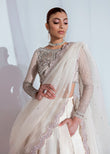 This set comes with an organza choli delicately embellished with silver sequins, pipe, and Swarovski, incorporating patent Hussain Rehar’s palm tree motif along with boat neckline. White satin lehnga with silver details.