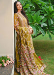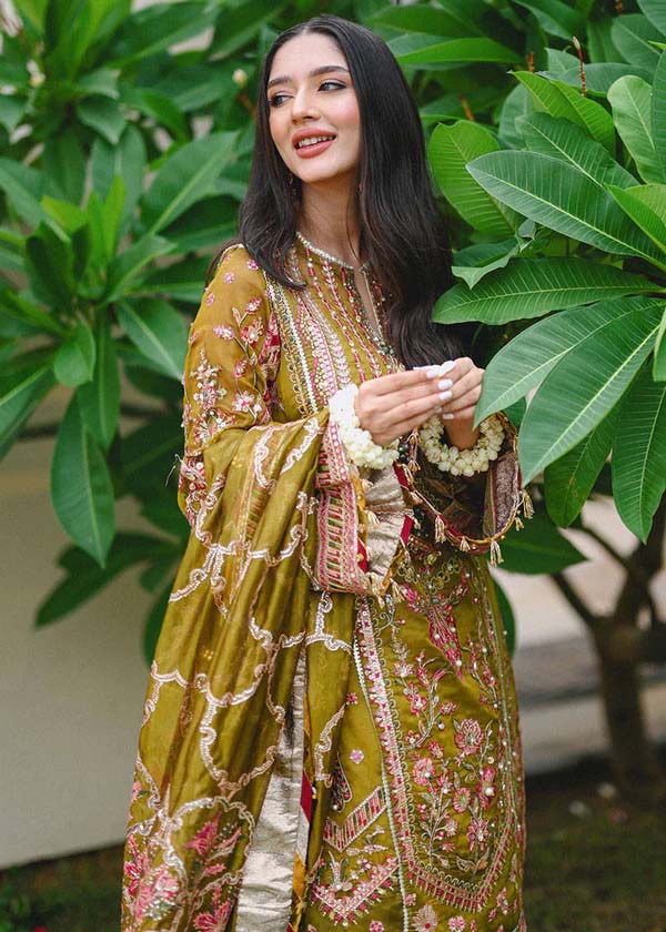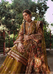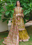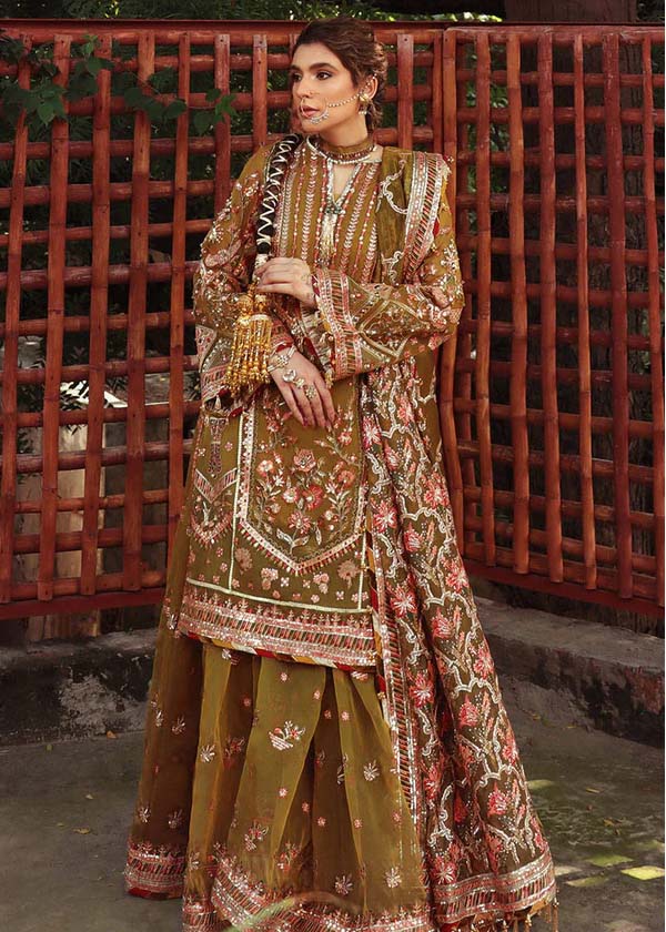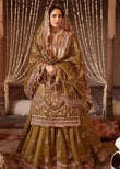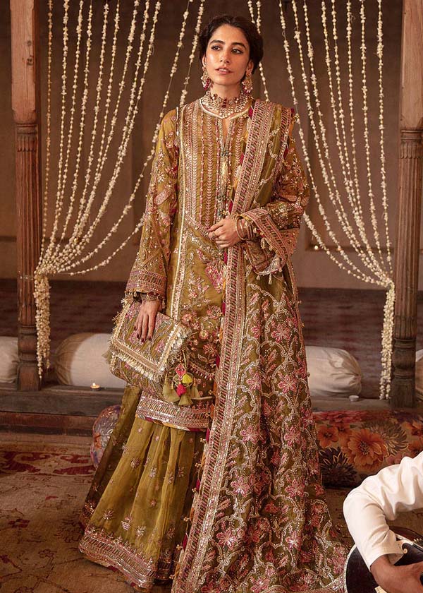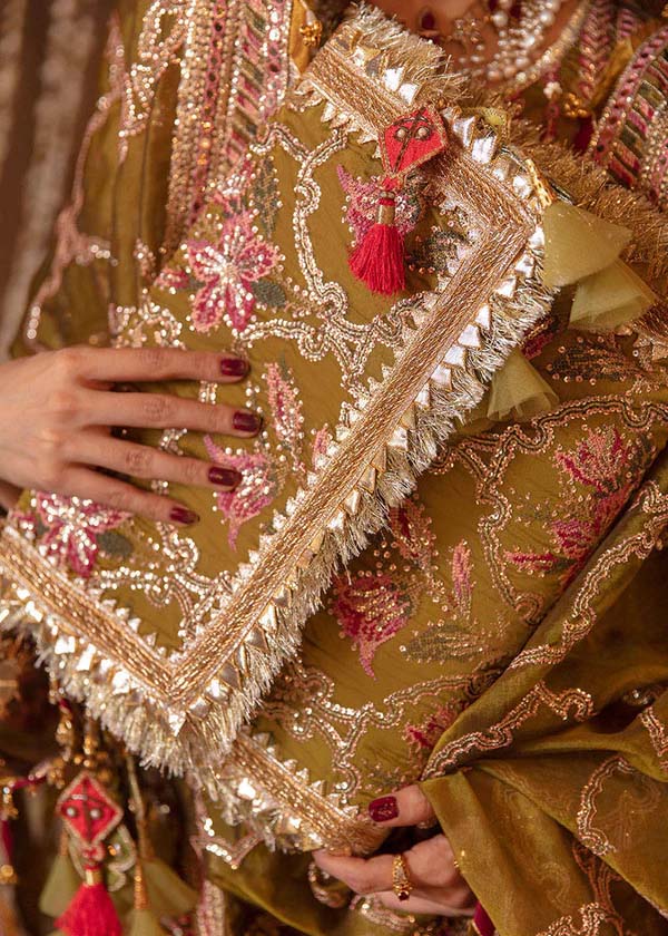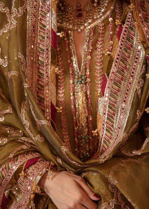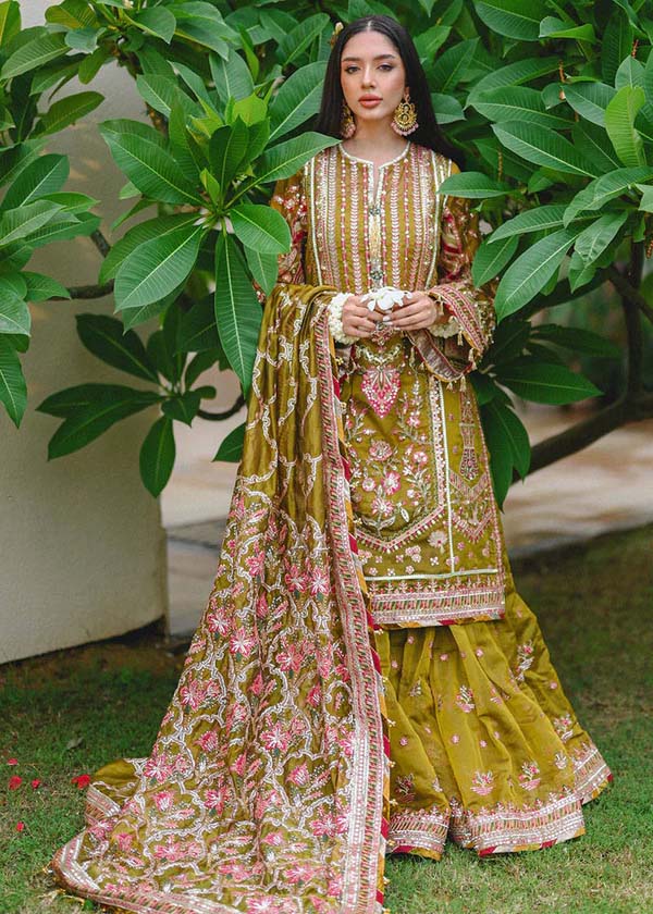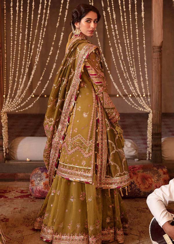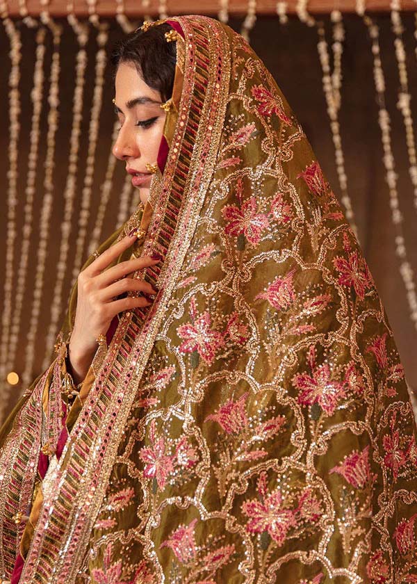 IQBAL BANO is a dhaani green gharara and shirt ensemble. The shirt is packed with floral motifs and studded with fine gold sequin work; this dreamy green color serves as a breath of fresh air. The gharara adorned with floral butti’s sprayed all across and an intricate border along the hem exudes youthful vibes. It is paired with a coordinating dupatta in matching color that features a delicate jaali/lattice and is adorned with elegant border that is bound to make a resounding statement.