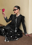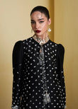 A masterpiece of elegance and artistry. This luxurious ensemble features a beautifully crafted farshi shalwar adorned with intricate multi head and hand embroidery, making every detail stand out. Paired with a chic short shirt, the design is brought to life with a delicate spray of 3D small flowers, each carefully embellished to perfection. The front closure dori is the centerpiece, exquisitely hand-embellished for a touch of timeless glamour. A perfect fusion of traditional craftsmanship and modern flair, this outfit is sure to turn heads at any occasion.