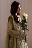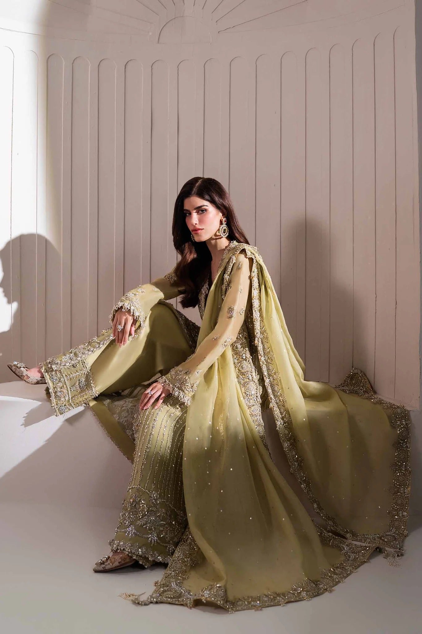 Indulge in the unparalleled splendor of 'Mélodie' where the rich heritage of tradition melds seamlessly with the pinnacle of contemporary luxury upon an ethereal organza canvas. This masterpiece is a celebration of artisanal excellence, adorned with painstakingly handcrafted gotta work and exquisite zardozi embroidery that evoke an air of timeless magnificence. The elongated, front-open silhouette of the shirt exudes regal charm, effortlessly draped alongside a dupatta that glistens with gold dust sequins, embodying an elevated sense of glamour. Completing this regal ensemble, the palazzo pants are enriched with an intricately embellished border of gold dust gota, zardozi, and lustrous pearls, creating a breathtaking contrast that enhances its sublime sophistication and transcendent grace.