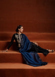 A glamourous black raw silk shirt with intricate hand work details of pink, green, tealblue, orange, gold and peach buggle beads, pink, orange, red, teal and green sequins, golden nakshi, and gold mukaish in the front of the shirt. It is paired with raw silk palazzo pants and a beautiful glitzy blue organza dupatta with black sequin and multihead borders on all four sides.