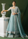 This ice blue net pishwas is gorgeously emberoided in hues of pinks and blues along with silver tilla. Adorned with pink and silver pipe work, mukesh, dabka, naqshi and stones.Completing the look with crushed silk sharara with heavy borders along with net dupatta featuring thick embellished four sided borders.