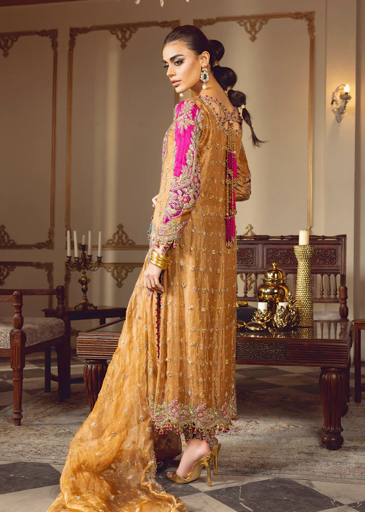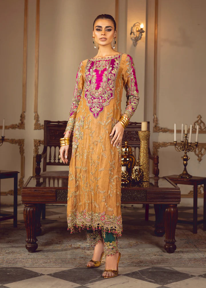 Experience regal allure with SULTANIQUE—a breathtaking ensemble in pale tangerine tissue, exquisitely adorned with taanka-detailed floral appliqués that echo the grace of timeless traditions. Rich embellishments weave together old-world artistry with contemporary sophistication, creating a masterpiece of refined elegance. To enhance the soft tangerine hue, the ensemble is paired with vibrant turquoise green raw silk trousers—infusing a joyful burst of color and a festive spirit into this radiant creation.