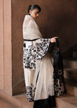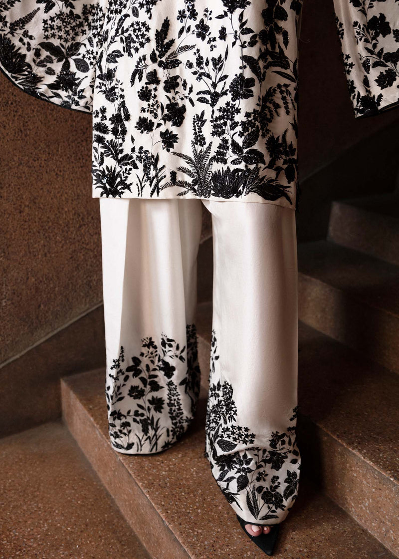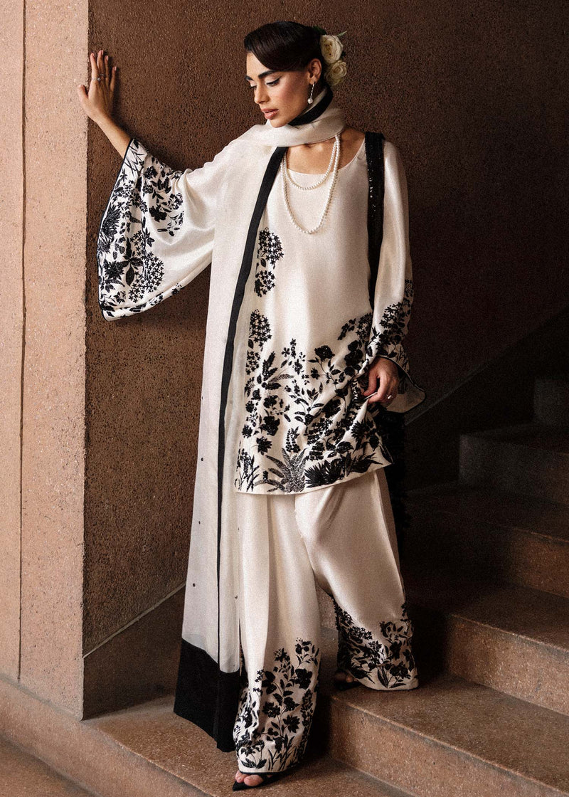 A beautiful ivory raw silk shirt with round and deep neckline, and heavily adorned front , back and sleeves with black embellishment of sequins , pipes, buggle beads, pearl and swarovskis. It is paired with a classic printed ivory shalwar with black embellishment. The 3 yards organza dupatta has black sequin spray finished with black satin on all 4 sides.