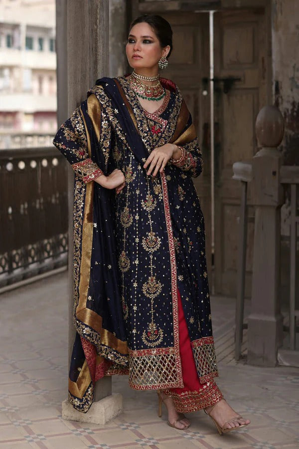 Look absolutely gorgeous in this navy angrakha! The shirt features red, green and gold flower details that adorn the neckline and body of the outfit. A heavy gold latice border anchors the shirt. The outfit is complemented by a stunning red dupatta that features dome buildings that are glistening in gold and a floral geometric pattern in the place of a sky.