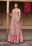 The formal embroidered and embellished organza Jacket is giving it a luxurious and intricate look. The trouser is a Korean embroidered raw silk sharara, adding a touch of elegance and uniqueness. To complete the ensemble, the embroidered jaal dupatta features organza with four side borders adding a beautiful finishing touch. This outfit is perfect for any special occasion or event!
